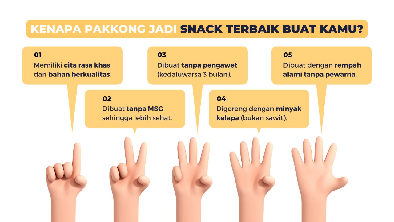 PAKKONG berangkat dari kesulitan yang dialami masyarakat dalam menemukan cemilan dengan rasa nikmat yang khas namun tetap mengutamakan aspek kesehatan dan kebersihan. Kami ingin masyarakat Indonesia memiliki cemilan dengan mutu dan rasa terbaik namun tetap terjangkau.